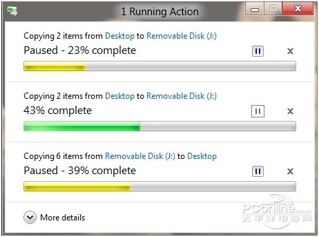 Win8中的“复制”、“粘贴”带来了大家期盼已久的进度框集成,在执行多任务复制时,进度条会全部自动整合到一个窗口,非常方便管理。同时还有新增的速度曲线图,让用户可以轻松测出传输速度。