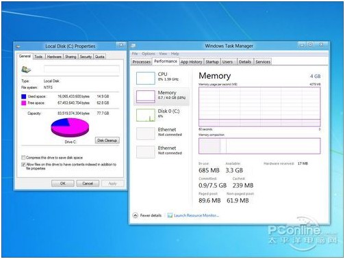 Win7最大的问题就在于内存占用比较大,Win8针对这个弱点进行了大幅优化,据称内存占用要比Win7至少低100MB,因此对硬件的要求更低。