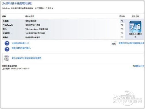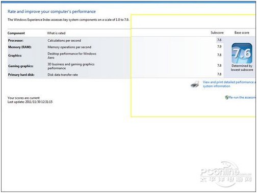 系统评分机制是Win7相对以往系统的一大创新,我们可以通过这里了解系统的基本性能。一般平台分数最低的会是硬盘,因此我们在这里采用了一个SSD固态硬盘,保证系统整体得分比较平衡。